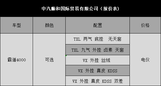 18款霸道4000长*宽*高(5010*1885*1845)搭载4.0L自然吸气发动机,采用缸内直喷供油方式,六档手自一体,马力275,扭矩381,主副油箱共可容纳150升。并有天窗,外挂,疝气大灯,中控大屏,炫彩仪表盘,遥控启动,KDSS底盘等多种配置可选。颜色主打,白,黑,金,银,灰。
