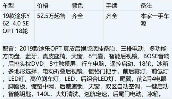 19款日产途乐Y62基本参数:长*宽*高5165*1995*1940MM 发动机:4.0L 279马力 V6 轴距:3075MM 油箱容积:140L 最大功率:205KW 最小离地间隙:273mm 变速箱:7档手自一体 最大扭矩:4000N.M 最大功率转数:5600 驱动方式:前置四驱 车体结构:非承载式。