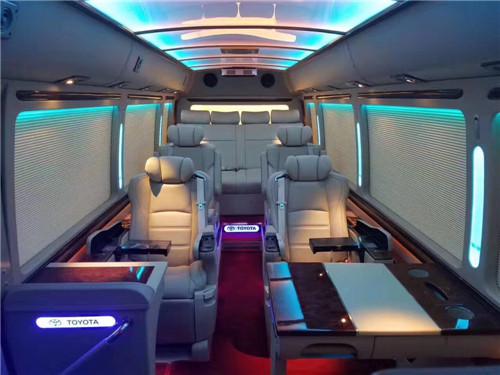 改装版的15座16座丰田考斯特从座位的布局上采取了后排座位数为四个,中间三排选用左二右一的的布局,前排为奢华首长席,而且装备工作桌以及固定秘书桌。在上车门的右端装置并向设备,主驾驭后有间隔别离。如此规划,搭车空间宽阔,规划交心,奢华的工作桌椅带给我们不一样的搭车感觉。