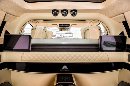 奔驰迈巴赫S600内部装饰延续了之前迈巴赫62的设计风格。后排贵宾座采用航空座椅设计,相比古斯特和飞驰更显奢华。在后排两张座椅的中间设置有车载冰箱,后车门结构经过了重新设计,同时在门板上还有独特的点缀。
