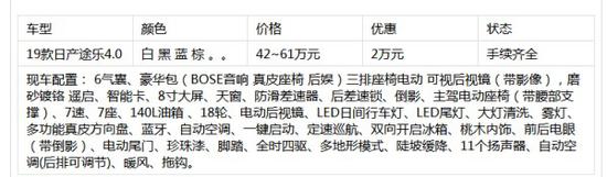 2019款日产途乐Y62 4.0 SE 变速箱+底盘转向:变速箱:7挡手自一体 前置四驱 四驱形式:全时四驱 中央差速器结构:全时四驱 前后悬架类型:双叉臂式独立悬架 助力类型:电子液压助力 车体结构:非承载式。