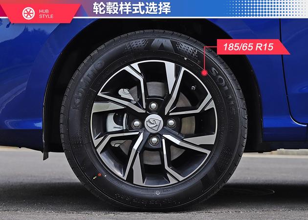 新车全系匹配的均为15寸轮圈,多辐铝合金轮圈造型时尚,轮胎尺寸为185/65 R15,实拍车上的轮胎品牌为锦湖,售价约为223元。