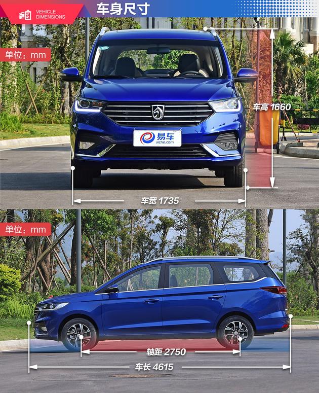 宝骏360的长宽高分别为4615*1735*1640/1660mm,轴距为2750mm。新车采用了 “2+2+2”座椅布局,定位6座车。外观让人过目不忘,新车采用了类似宝骏530那种棱角分明的设计语言,无论是车头还是侧面的线条都处理的十分到位,让新车的档次提升了很多。