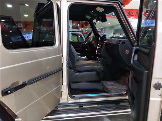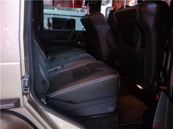 新款奔驰G5004X4内饰采用AMG高性能方向盘,使用黑色Nappa真皮和翻毛皮包裹,手感出色,集成了多个常用的多功能按键,同时具有换挡拨片。座椅具有多向电动调节、座椅记忆、座椅加热等功能。新车提供多种颜色搭配,提供designo黑色钢琴漆饰件,也可以选装designo香槟白色钢琴漆饰件。新车搭载的全新的COMAND NTG 5信息娱乐系统包含了具有特别附加越野功能的导航系统、LINGUATRONIC多媒体语音控制系统等功能。很多客户问我,奔驰G500和奔驰G5004x4有什么区别。如上图,左边的是奔驰G550 4x4[金色]。右边是奔驰G550[白色] 4X4外观上要比普通G550大一圈多。