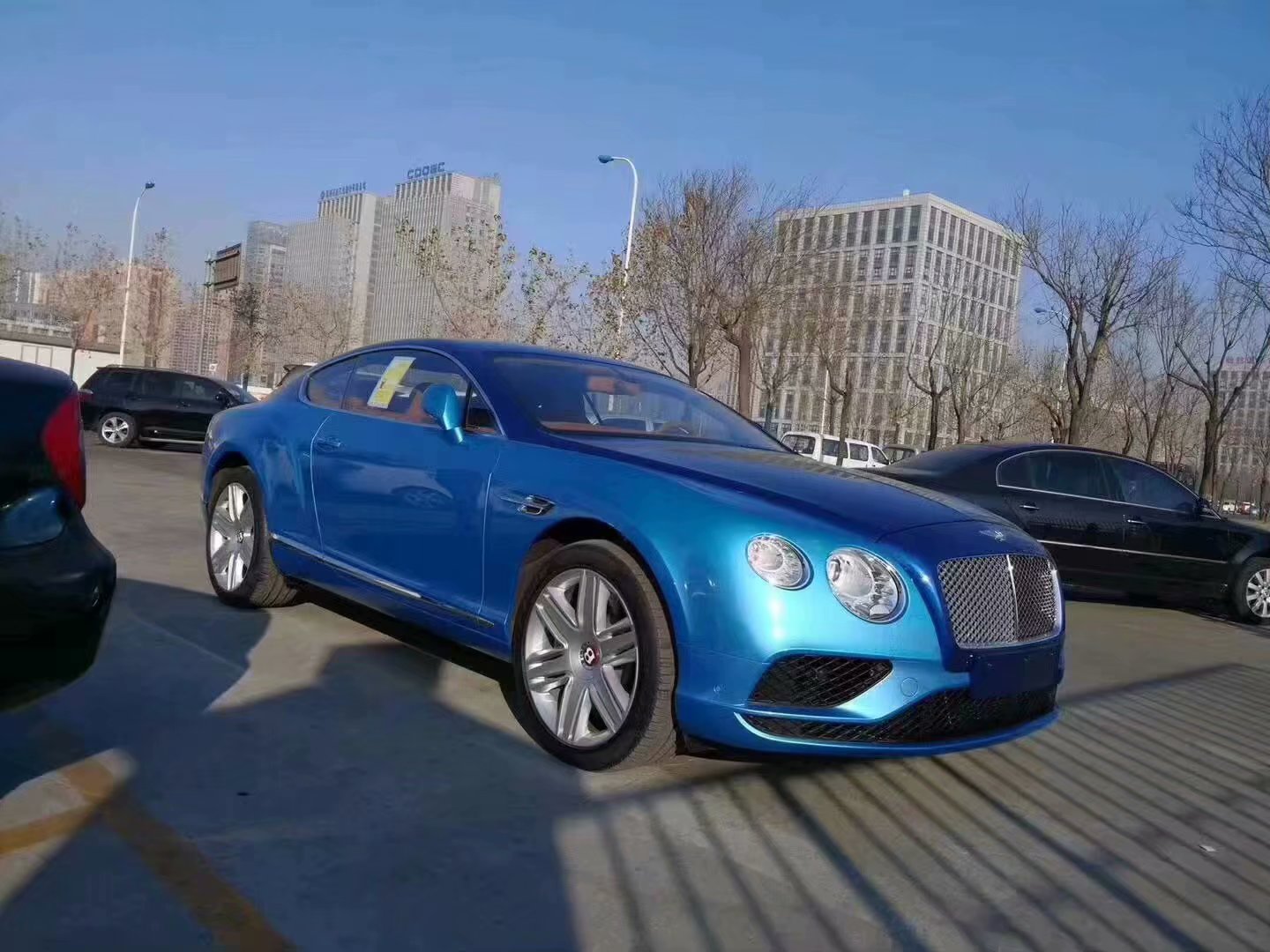 宾利欧陆在GT轿跑里算偏大的,尺寸为4818*1947*1401,轴距2746,跟一些B级四门轿车差不多。侧面线条优雅而饱满,特别是车门后方区域,有明显的肌肉感。前翼子板处设计了一个通风口,门板下方有一道镀铬亮条贯穿。这台样车配置的是六幅轮毂,轮胎规格为275/40 R20,属于“大脚”了。