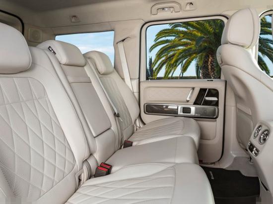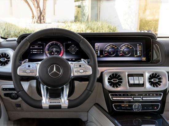 全新G63内饰方面,新G63保留了新G500的整体设计,除配色差异外,新车还换装了全新造型的平底式AMG运动方向盘,其两侧配以打孔皮质包裹,下部镀铬装饰的造型也与新G500明显不同,看上去十分战斗。此外,全液晶仪表盘+中控大屏的双12.3英寸屏幕设计在新车上也没有缺席,营造出了浓郁的科技感