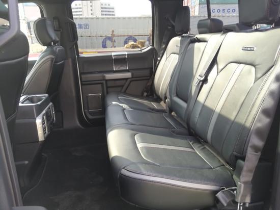 福特F150内饰采用独特的中控台和门饰板面漆和真皮包裹的方向盘。中控台部分辅以银色饰板装饰,六指针仪表盘的设计有些后工业时代的复古风格。采用带电冷热功能的可记忆式皮革座椅,头枕四向可调,搭配铝饰条和黑色钢琴烤漆内饰。可电动升降的后窗带隔板和电热除霜功能。 进口18款福特猛禽F150皮卡真皮座椅包裹性很强,无论是越野还是长途旅行,都很舒服,丝毫不感觉到这大家伙的压抑,二排空间也是十分宽敞,乘坐四个身材高大的乘客绝对没问题。座椅折叠起来可以放一个冰箱,而且门上储物格空间也是够用,虽然不像公羊后排那么豪华,有简易床,但是这种实用的理念就是福特的宗旨。