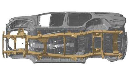 从第三代三菱帕杰罗开始,取消了非承载式车身设计,镶嵌进底盘的加强梁与梯形框架结构通过先粘合再固定的工艺形成了一体式车身结构,即内嵌式大梁结构,与传统的非承载车身、带大梁的车身结构相比,加强了舒适性,燃油经济性,强度则损失不大。