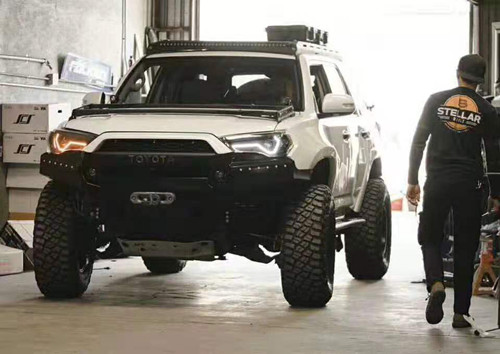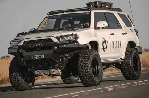 全系车型的长宽高三围约:4米85 x 1米95 x 1米85,每个车型有小许差别,全系标置4.0发动机(没有其它排量),五速自动变速箱(有人会说五速自动变速箱已老到掉牙了,呵呵,这只懂其一)。实际上4Runner在美国市场的定位为一款中型SUV,并非硬派越野车,这是由美国高速路发达、远途旅行繁荣的背景决定的,因此一款擅长远途穿越的硬派SUV要远比一款高爆发力的硬派越野车受欢迎。单从外观上来看,4Runner TRD的八字形进气格栅、越野胎、高底盘等特性就远比霸道更霸道,再加上丰田为了紧抱美国市场大腿,将美国人更喜欢的肌肉线条融入进车身外观,使得这款车在气场更硬朗。