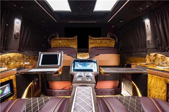 后仓高端液晶操控台,支持按键和触屏更有语音控制系统,更有逼格更有范儿了!整车的内饰配件都采用模具化生产,方便维修减轻车的重量,确保配件的供应,全车线束特约德国奔驰工厂线束专家研发设计,与改装车的私接乱改有所不同,使车辆更加安全,无后顾之忧!室内配有左右两侧电动隐藏办公桌板,iPad互联电脑、室内声控电动控制系统,电动窗帘、隐藏迷你保险柜、迈巴赫顶灯,所有饰条选用泰国珍稀树种虎斑檀木,工艺为实木纹贴皮,工艺精细,优雅高端大气,地板选用古巴影木全铝地板,不易变形坚固耐用,地板拼花为激光雕刻而成,极具现代奢华感,整个室内的设计已经提前超越了不止是五年,领国内外众多工厂都自叹不如!