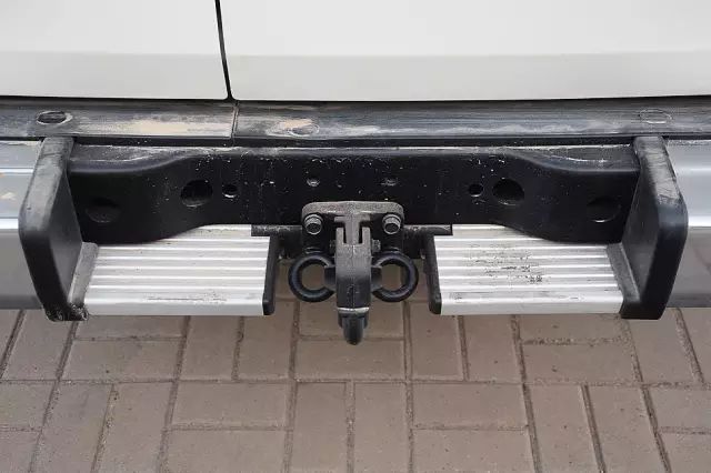 车尾的造型也十分简洁、平整,车尾的金属踏板和裸露粗壮的拖车钩与车身的大梁相连,可承受更大的压力。