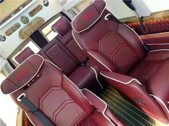 在内饰设计方面,整个贵宾舱全部采用进口小牛皮包裹,奢华质感浓郁!前部悬浮式吧台造型新颖,承载着BOSE音响单元、丰富储物格等。 吧台上方是一台32寸可升降液晶电视,可与车载苹果主机系统连接随时可观看网络影片;亦可在旅途中为同伴展示商业资料!