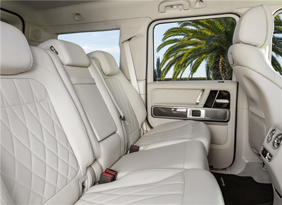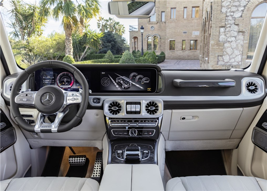 19款奔驰G63内饰方面,19款奔驰G63保留了新G500的整体设计,除配色差异外,新车还换装了全新造型的平底式AMG运动方向盘,其两侧配以打孔皮质包裹,下部镀铬装饰的造型也与新G500明显不同,看上去十分战斗。此外,全液晶仪表盘+中控大屏的双12.3英寸屏幕设计在新车上也没有缺席,营造出了浓郁的科技感。
