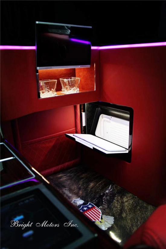 可升降蓝光DVD播放系统,三屏显示,英国之宝825W顶级环绕音响系统,车内氛围灯,后排LED吸顶照明灯,后排独立空调控制系统,电动脚踏板,爱马仕订制窗帘,后排隐藏式密码保险箱,无线充电。