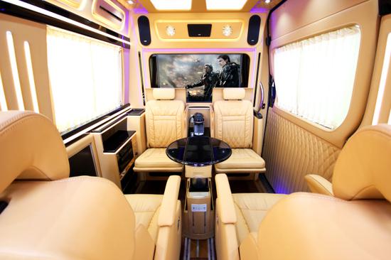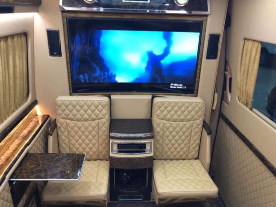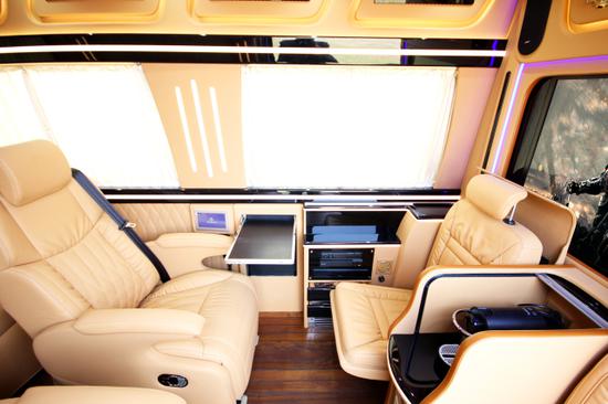 多功能精致的吧台,大容量的恒温电加热水壶,酒柜和水晶酒杯,DVD及美国顶级bose音响,超大屏的40寸液晶电视旋转90度车门处,车外也能悠闲的沐浴阳光,惬意的听音乐看电影。黑色搭配时尚亮米色,衬托了优雅高贵的气氛,高低错落造型古朴淡雅,精美别致,看到如此美丽景象,身心自然愉悦豁然开朗。