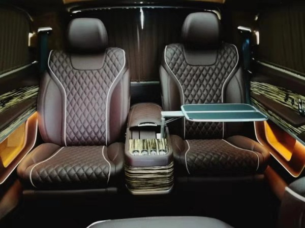 进口奔驰V250 商务车改装商务七座高级配置:前后舱双电池供电系统,GPS全球卫星导航系统带倒车影像,驾驶舱便携式电子冰箱,贵宾舱冷暖气分离出风口,进口奔驰V250 商务车改装改装商务车前后舱双空调独立控制系统,一键式超静音32寸高清液晶升降电视,日本健伍5.1影院级音响系统,220v电源接口USB.VGA多功能连接口,车载触控屏中控系统,车载智能空气净化器,全车豪华雀眼枫木装饰,全车柚木铝质地板,意大利进口Alcantaran麂皮绒顶,对于商务谈判与居家来说,这一切的配置都来得恰到好处。