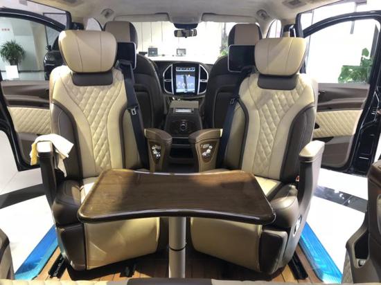 内饰方面:皮革包覆仪表台,鹿皮绒内饰,11.8寸安卓后排娱乐系统,12.1英寸超大屏导航,全车桃木,桃木方向盘,多功能中央扶手箱带冰箱、杯托、220V电源、USB接口,二排头等舱8项智能座椅(加热、通风、按摩、旋转),三排豪华电动床,木地板,车内氛围灯,镀铬豪华迎宾踏板,窗帘,门拉手钢琴漆。