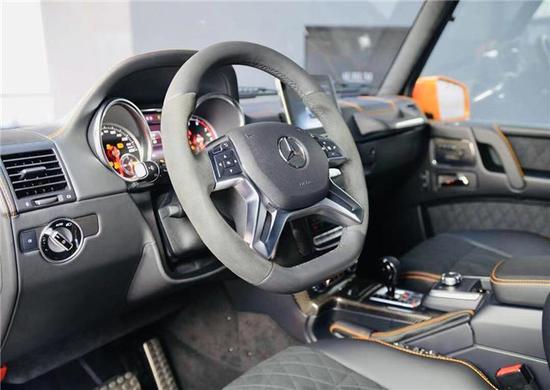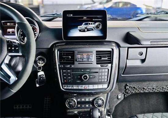 从内饰来看,新一代G级使用了奔驰品牌最新的家族式设计元素,包括仪表盘、中控显示屏、空调控制区、COMAND操作区和带有双拇指控制(Dual Thumb Controls)的三辐式方向盘等。中控台上的“3把锁”、副驾驶前方的扶手等G级经典的设计元素在新车上均得到保留。中控台功能按键盘设计比较紧密,但是做工精细。中控台配置COMAND信息娱乐系统和一个8英寸大尺寸液晶显示屏。