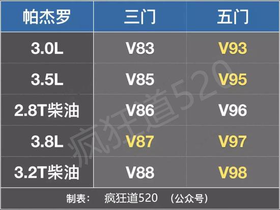 平行进口中东版帕杰罗,不仅有V97,还有V93、V95、V98,以及三门版的V87,而中规进口版帕杰罗,则只有V93。这五个型号的关系划分,可以看这个表: