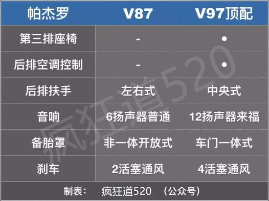 中东版帕杰罗销量第二大的,是三门版V87。V87目前只有顶配车源,不带后娱,跟V97顶配之间的配置差别,可以看这个表: