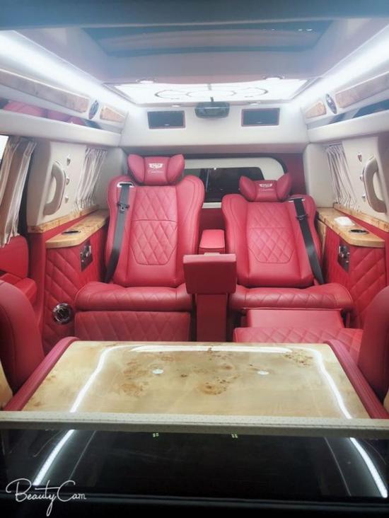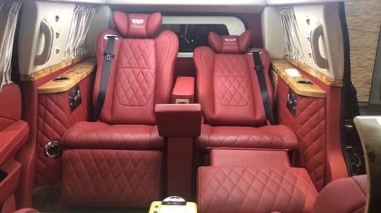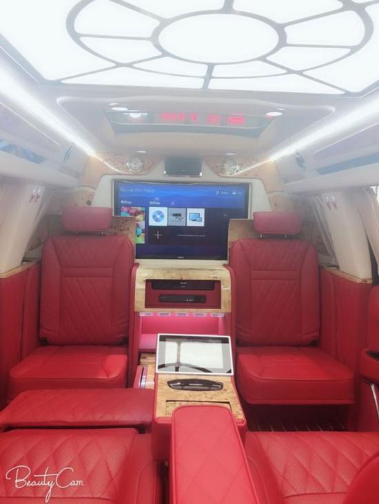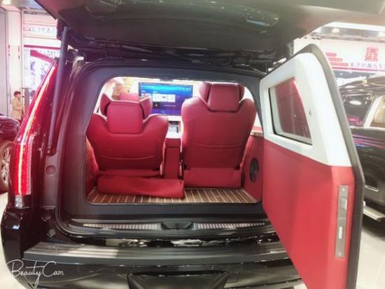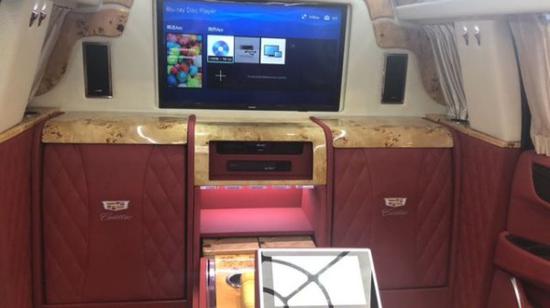 凯迪拉克总统一号隐藏六座商务车内饰部分:舱内隔断:可升降分隔屏,32寸超薄液晶电视 音响设备:BOSS环绕音响,DVD 舱内灯饰:氛围灯 LED灯饰,迈巴赫棚顶灯 舱内吧台:酒柜 咖啡机舱内桌板:电动隐藏式伸缩桌板 地板材质:柚木地板 舱内天窗:全景开启式大天窗。