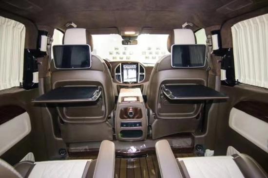 内饰方面配备娱乐影音,前舱蓝光DVD影碟机,吸顶高清液晶电视,需要时可以往下翻,按钮一按,最新热点、时尚资讯随时掌握。座椅旋转对坐,柚木地板上配置有可拆卸小方桌,时尚钢琴烤漆,高承重性,任意开启商务洽谈模式。后座三连排电动沙发座椅,向后拓展可一键平躺变身奢华大床,商务出行可作为休憩佳所;合家出游,便是小朋友的专属娱乐天地。