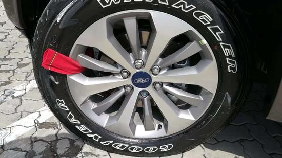 18款福特F150 3.5T的轮毂最为独特,新车最新的轮毂是把可靠的传统轮毂和防脱圈的轮毂结合起来了。这款防脱圈轮毂可以保证在轮胎气压较低的情况下,轮胎不会脱离轮毂,因为我们去沙漠的时候往往要降低胎压。并且它从传统轮毂转换到防托圈只需要客户拔去标准螺栓,从其常规位置卸下轮胎然后从可锁位置重新安装轮胎,再装防脱圈螺栓即可。