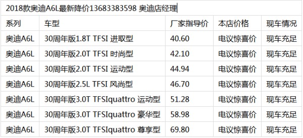 为在厂家销售任务,特此在举办特价活动,北京5家一汽奥迪4S店联合推出“2018款奥迪A6L零利润团购会”,奥迪A6L现车68台降价大促销,裸车价格最高直降多少钱。现店内现车充足,颜色齐全,销售全国,无区域限制,手续齐全(发票,合格证,车辆一致性证书,PDI检测证书,保养手册,三包凭证)。