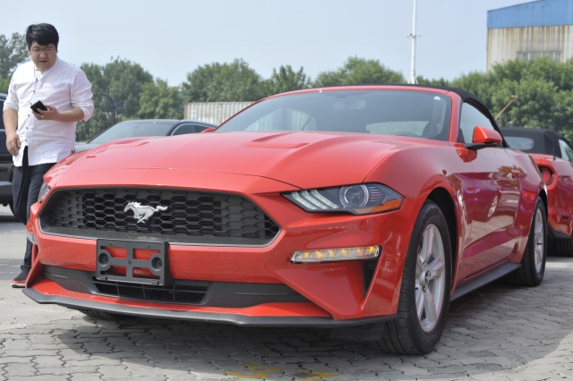 福特野马2.3T标准版车型,外观与老款差别不大,从前方看,大灯造型改变明显,由眯缝眼变成了横眉立目,前雾灯LED组更多,并下弯形成锐角进气口,前发动机盖也增加了两个方形口,可以改装成进气口或其它装饰。车侧的转向灯取消了,侧面看起来更平整。