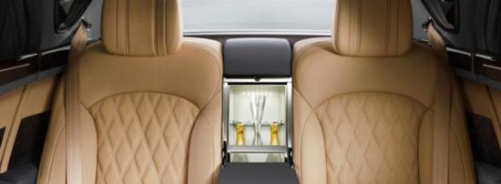 佳酿饮品冷藏箱Mulliner 专为慕尚设计了三款冷藏箱作为可选配置,每一款均可体现出宾利的经典精湛工艺。第一款冷藏箱可容纳两瓶饮品和水晶杯;第二款可容纳香槟酒瓶和酒杯。第三款可容纳酒瓶、水晶酒杯和宾利小酒壶。饮品器具存放在后座椅之间,冷藏系统隐匿于行李箱中,为每一次非凡之旅奉上怡人的舒爽。如同所有宾利酒瓶冷藏箱一样,冷藏系统虽然设计在后座之后,但对行李箱空间没有丝毫影响。