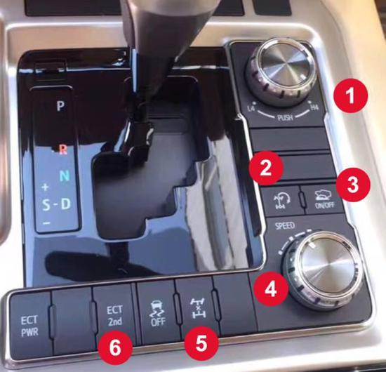 新加入的挡把周围一圈驾驶相关的功能面板,提供了丰富的越野及驾驶辅助功能, 购车 13910067572 北京老吕,圈1是低速四驱、高速四驱的模式旋钮,按下生效,圈2是坦克转向功能,圈3是坡道辅助,圈4是蠕行功能,旋钮可以调节速度,圈5是中差锁,圈6低速起步控制。ECT OWR则相当于变速箱运动模式,5和6之间的按钮是动态车身稳定系统的关闭按钮,可在极端湿滑路况时关闭,避免电子系统干扰动力输出。