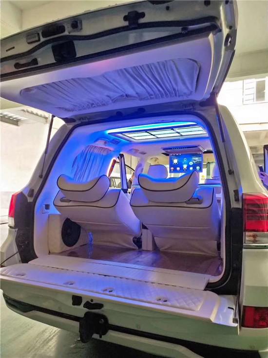改装后的丰田酷路泽采用2+2整车4座布局,中间由半隔断处理(可选全隔断),吸顶电视和电器设备不可少,