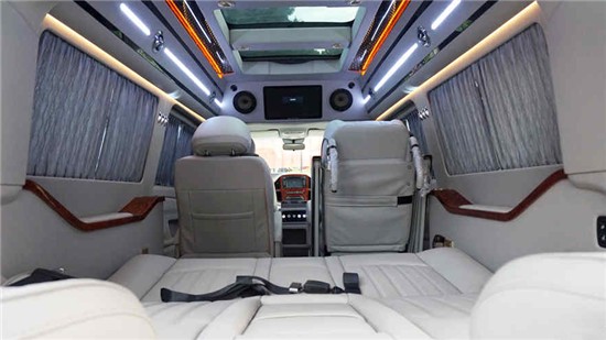 一进入车门,磨砂质感镂空星空灯,双天窗设计,灰色系的进口真皮座椅,瞬间温软和放松。液晶电视、环绕音响,或躺靠着看场电影,听听戏曲,帮助放松身体,无意识地缩短了出行距离!后舱更享科技化的电器触摸控制系统。空气净化器、车载冰箱、USB+220V电源、杯架为出行带来更多便利。
