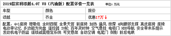 2019款宾利添越V8汽油版搭载的是4.0T双涡轮增压汽油发动机,其最大功率为404千瓦,峰值扭矩达770牛米,百公里加速时间可控制在4.5秒内,新车最高时速可达每小时290公里。