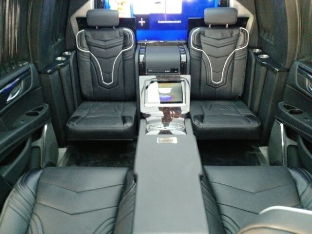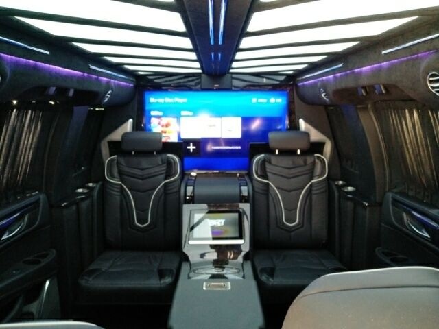 19款凯迪拉克总统一号隐藏六座商务车内饰部分:舱内隔断:可升降分隔屏,32寸超薄液晶电视 音响设备:BOSS环绕音响,DVD 舱内灯饰:氛围灯 LED灯饰,迈巴赫棚顶灯 舱内吧台:酒柜 咖啡机舱内桌板:电动隐藏式伸缩桌板 地板材质:柚木地板 舱内天窗:全景开启式大天窗。