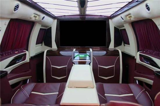 凯迪拉克总统一号隐藏六座商务车内饰部分:舱内隔断:可升降分隔屏,42寸超薄液晶电视 音响设备:BOSS环绕音响,DVD 舱内灯饰:氛围灯 LED灯饰,迈巴赫棚顶灯 舱内吧台:酒柜 咖啡机 舱内桌板:电动隐藏式伸缩桌板 地板材质:柚木地板 舱内天窗:全景开启式大天窗。