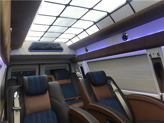 福特E350采用隔断式设计,搭载电动窗帘系统,驾驶舱与乘客舱豪华隔断,使整个车厢享有高度的私密性,且在隔断处配备了大屏可升降的LED高清电视、Bose5.1环绕音响、DVD蓝光影碟机,打造了一个立体环绕极具氛围感的影音包间。