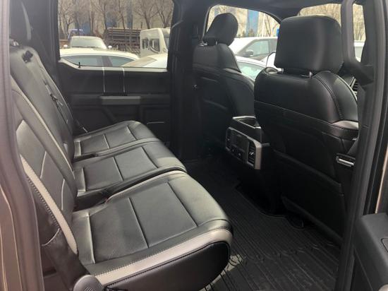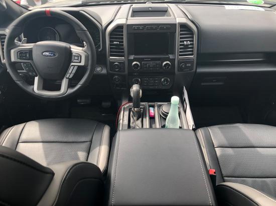 2018款福特猛禽F150内饰采用独特的中控台和门饰板面漆和真皮包裹的方向盘,中控台部分辅以银色饰板装饰,六指针仪表盘的设计有些后工业时代的复古风格,采用带电冷热功能的可记忆式皮革座椅,头枕四向可调,搭配铝饰条和黑色钢琴烤漆内饰,可电动升降的后窗带隔板和电热除霜功能,真皮座椅包裹性很强,无论是越野还是长途旅行,都很舒服,丝毫不感觉到这大家伙的压抑,二排空间也是十分宽敞,乘坐四个身材高大的乘客绝对没问题,座椅折叠起来可以放一个冰箱,而且门上储物格空间也是够用,虽然不像公羊后排那么豪华,有简易床,但是这种实用的理念就是福特的宗旨。