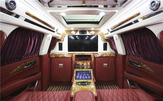 前后车舱私密隔断屏设计,2018款凯迪拉克总统一号,后部乘客舱采用“众树之父”的岑木内饰搭配,麂皮绒与真皮完美结合,双圆弧形顶灯设计让人耳目一新;中隔断电器影音配置有40寸可升降液晶高清电视,殿堂级BOSE音响系统和索尼DVD影碟机。还有温度显示、时间显示系统,以及车内隐藏吧台座椅、隐藏式咖啡机等。后舱大环境十分典雅舒适,乘员日常出行娱乐生活享受,基本可以在凯迪拉克房车内实现或得到满足。