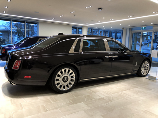 前脸部分,2019款全新幻影的前格栅,尺寸比老款车型进一步增加,因此“欢庆女神”的位置比老款车型升高半英寸,同时也加入了更多富含科技感的配置和设计元素。新车大灯采用了LED光源,而日间行车灯造型变为一个环状等带,转向灯隐藏在大灯组之间,而原来转向灯的位置变为进气口,为增压器散热。