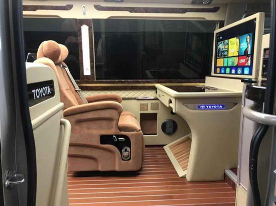 丰田考斯特12座配备了真皮桃木办公桌,在办公桌的上方还装有纸巾盒。反向汇报座椅也是丰田考斯特12座商务车的特色,可以向领导汇报工作用,也可以三个领导坐在一起打打扑克和商讨工作。进口压缩机冰箱,制冷效果可以达到零下18度,在炎热的夏天可以放一些饮品和水果,想想都很开心