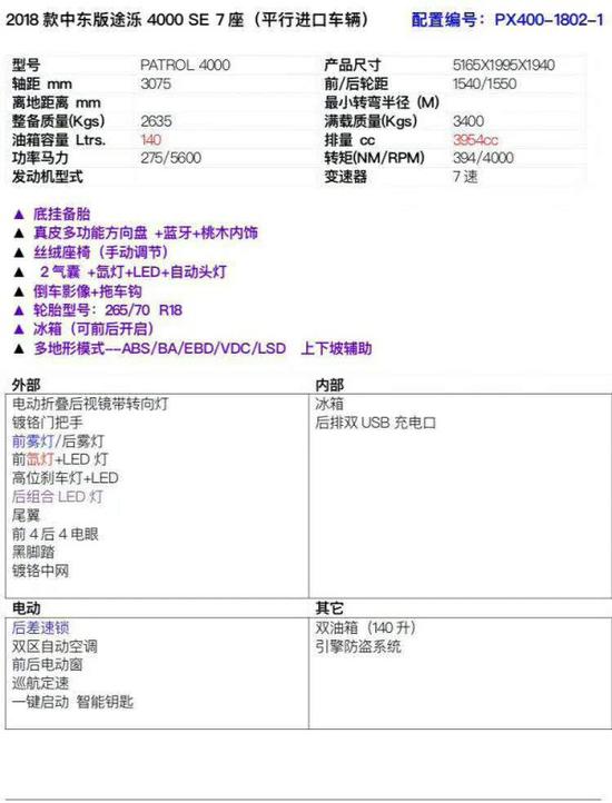 2019款尼桑途乐长宽高5165×1995×1940㎜,轴距3075㎜,7座,转弯直径12.6米,油箱容积100+40L。接近角34.3°,离去角26.2°,最小离地间隙273㎜。日产途乐4.0L全时四驱,非承载式车身(越野车必备),前后双叉臂独立悬挂,中央限滑差速锁,后桥差速锁。7速手自一体变速箱。