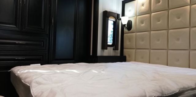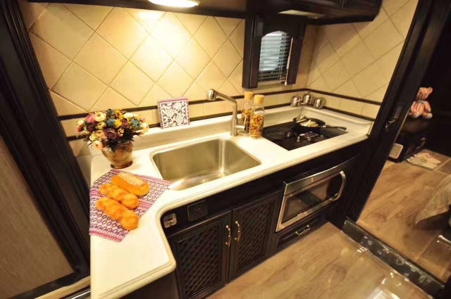 纵观内饰,就如同是可以移动的家或是公司,用途也非常的多。这也是为什么小编说他是高端、奢华、精美了。与这款车霸气的外观相比,它的内饰则更多地展现出了优雅与奢华的风格,米白皮质的沙发和桃木内饰豪华而优雅,宽敞、舒适的乘坐空间让您在总统房间尽情享受。驾驶室采用自动升降驾驶座椅、车头间断式雨刷、电子打火辅助装置等标准配置;在卧室设置了长1.90米,宽1.50米的女王级大床、19英寸的高清晰液晶电视、配有精心雕饰的床头板;厨房采用Dream Dinette厨具式布局风格,包括280升的双开门式电冰箱、净水系统、耐磨树脂、玻璃墙面、厨房内家居型麻油布地毯、Honex坚固光滑厨台、GE对流式微波炉、全银器式餐具等。