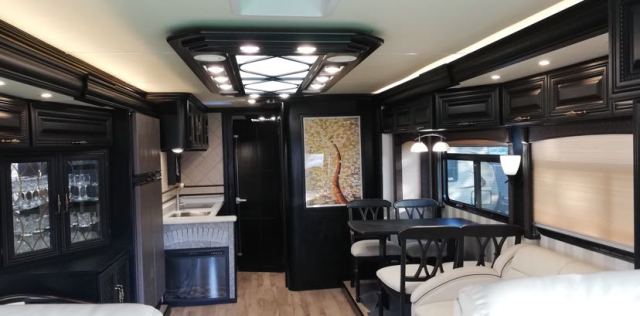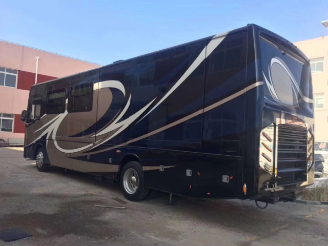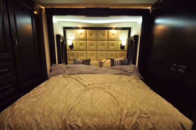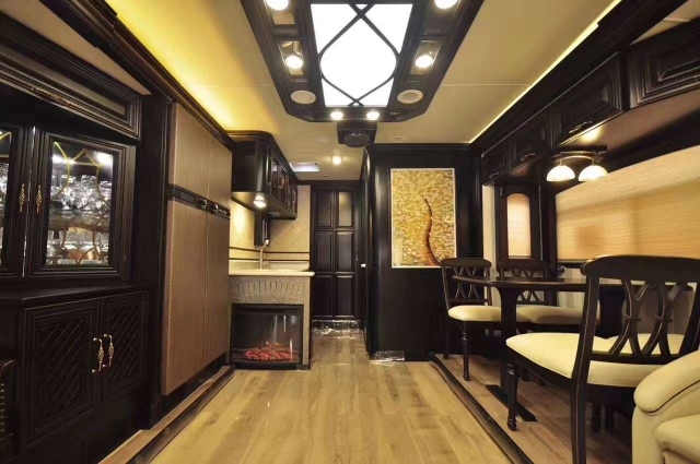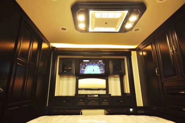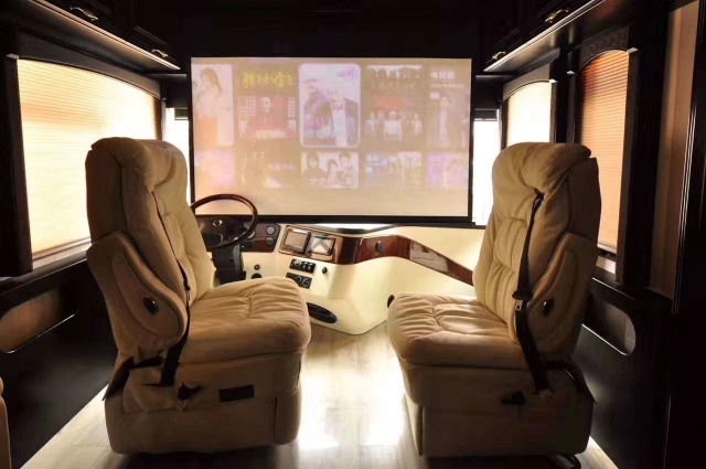 豪华配置:防蝇门,高级实木家具,移动实木茶几,客厅40寸高清液晶电视,电动78寸投影,哈曼卡顿5.1声道家庭影院,房车智能管理系统,客厅双向拓展,双层窗帘,双人沙发床,休闲商务座椅,实木酒柜,实木餐桌椅,300L双开门三用冰箱,客厅房车专用空调,客厅燃气暖风机,客厅电动换气扇,壁炉,壁灯,220v电源,厨房大理石台面,洗菜盆,双灶电磁炉,40L电烤箱,厨房换气扇,豪华卫生间,即热式热水器,整体淋浴室,卫生间换气扇,卧室双向拓展,卧室双人床,卫星电视,卧室32寸高清液晶电视,卧室专用空调,卧室实木吊顶,软包床头背景,卧室燃气暖风机,卧室梳妆台, 尾部超大空间衣柜。
