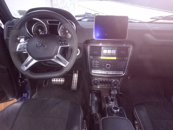 从内饰来看,新一代G级使用了奔驰品牌最新的家族式设计元素,包括仪表盘、中控显示屏、空调控制区、COMAND操作区和带有双拇指控制(Dual Thumb Controls)的三辐式方向盘等。中控台上的“3把锁”、副驾驶前方的扶手等G级经典的设计元素在新车上均得到保留。中控台功能按键盘设计比较紧密,但是做工精细。中控台配置COMAND信息娱乐系统和一个8英寸大尺寸液晶显示屏。