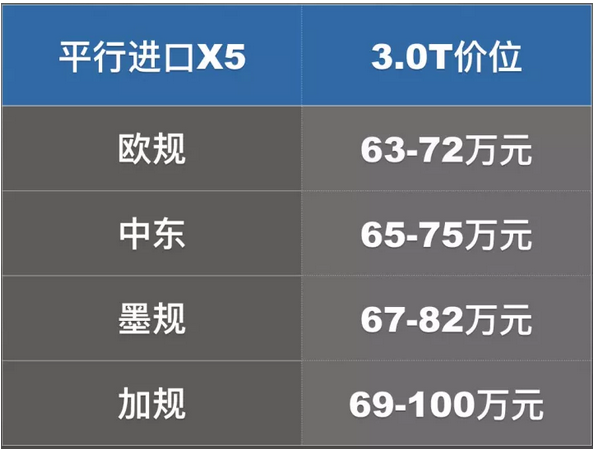 中规的销售主力也是3.0T,跟中规比,平行进口X5的最大优势当然是价格,在配置相同的情况下,价格比中规低八九个点左右。