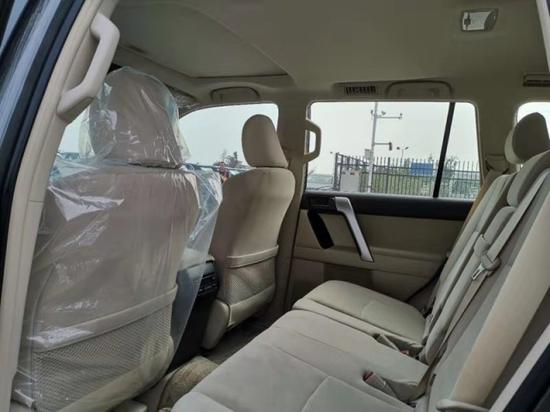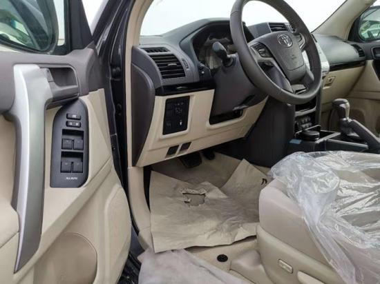 此款车采用的是米色内饰,因为中东地区比较炎热,座椅方面,采用的是米色内饰丝绒座椅,然后方向盘它配有原装的多功能方向盘以及定速巡航。前后安全配置加安全气囊面板方面,它配有CD机以及自动空调,但是这款车自动空调后排也是可以独立调节的,配有一键启动,以及高低速四驱、二挡起步、防侧滑、差速锁以及下坡辅助,中东标配的是冰箱和一个可以开启的小天窗。