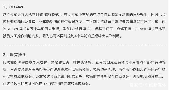 以相反的方向运行就可以完成原地掉头。LX570这套系统采用相似原理,转弯时内测轮胎会自动锁死,外侧轮胎持续输出,让这台硕大的车身可以在很小的空间内完成转弯或掉头。它的接近角、离去角在越野车中不是最出色的,甚至长达2850毫米的轴距在越野路况下其实并不占优势,但在强大的四驱系统和电子辅助系统的加持下,这台车的越野能力实际表现真的是非常出色。不过这种强大和传统硬派越野还是有很大区别的,拿牧马人来举例,LX570没有牧马人玩儿起来那么有趣,给人更多的感受是简单与自信,是金钱砸出来的泰然自若。
