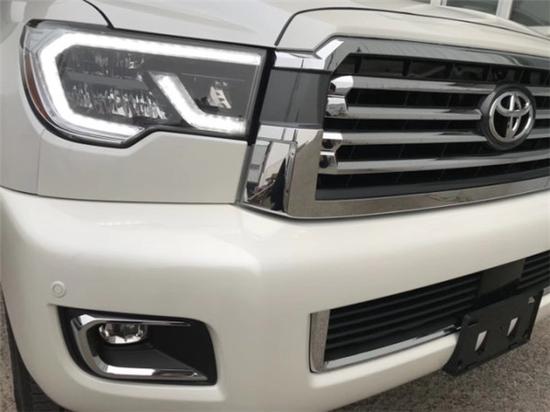 18款丰田红杉5700 V8是一款备受美国车迷青睐的超大型SUV,车身长为5.2米,宽2 米,高1.9米,轴距3.1米,健硕的车身,粗犷的线条,宽敞的空间,强劲的动力,无一不彰显丰田家族SUV的魄力和风范。18款丰田红杉5700白金版的前脸被宽大的进气格栅所霸占,两侧的大灯和进气格栅组合成了形式牛头的图案,发动机盖上微微隆起的线条彰显了出了肌肉感,这和红杉整车的气质十分相配,而前保险杠后面隐藏着的大梁,会让您在行车时充满了自信和安全感。