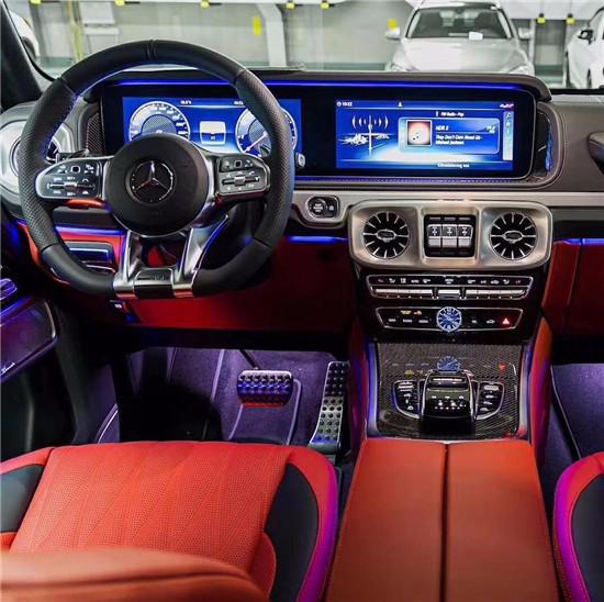 相比老款车型,全新奔驰G63采用了最新的双屏幕式设计,全液晶仪表盘和中控台屏幕都达到12.3英寸。同时内饰质感和工艺都有了很大的进步。融入了不少现款奔驰S级、E级的设计元素。家族式的连屏设计则凸显了车内的科技感,从而变得更加豪华。